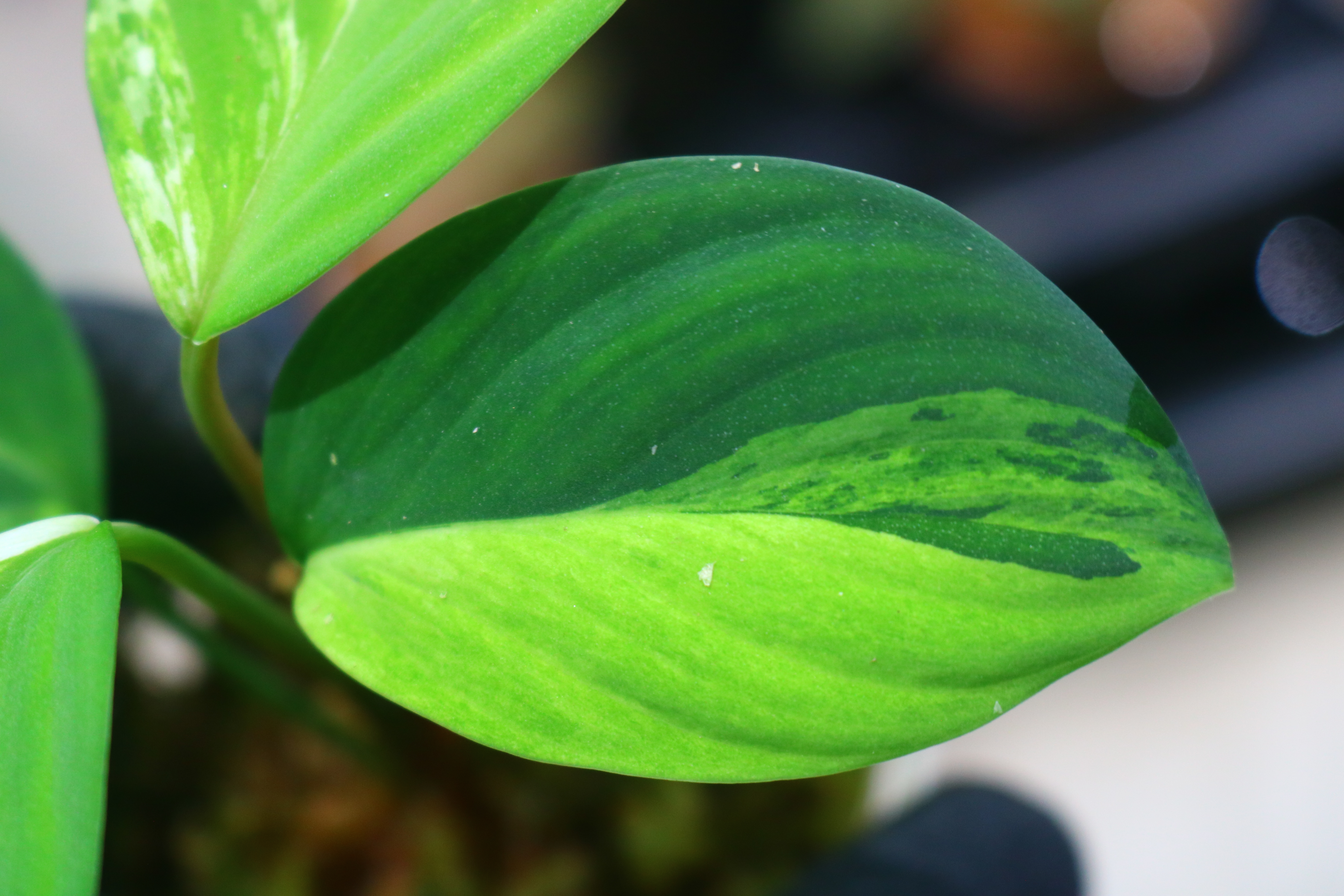 ベルベットの葉に鮮やかな黄緑色や白、クリーム色の様な斑が入っており、深い緑とのコントラストがすごくキレイで存在感がすごいです!